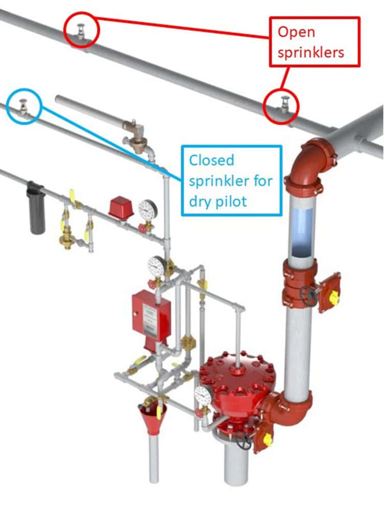 This diagram shows a deluge valve with its associated piping and trim. Here, the valve is actuated by a dry (pneumatic) pilot. Image source: Viking (annotation added)
